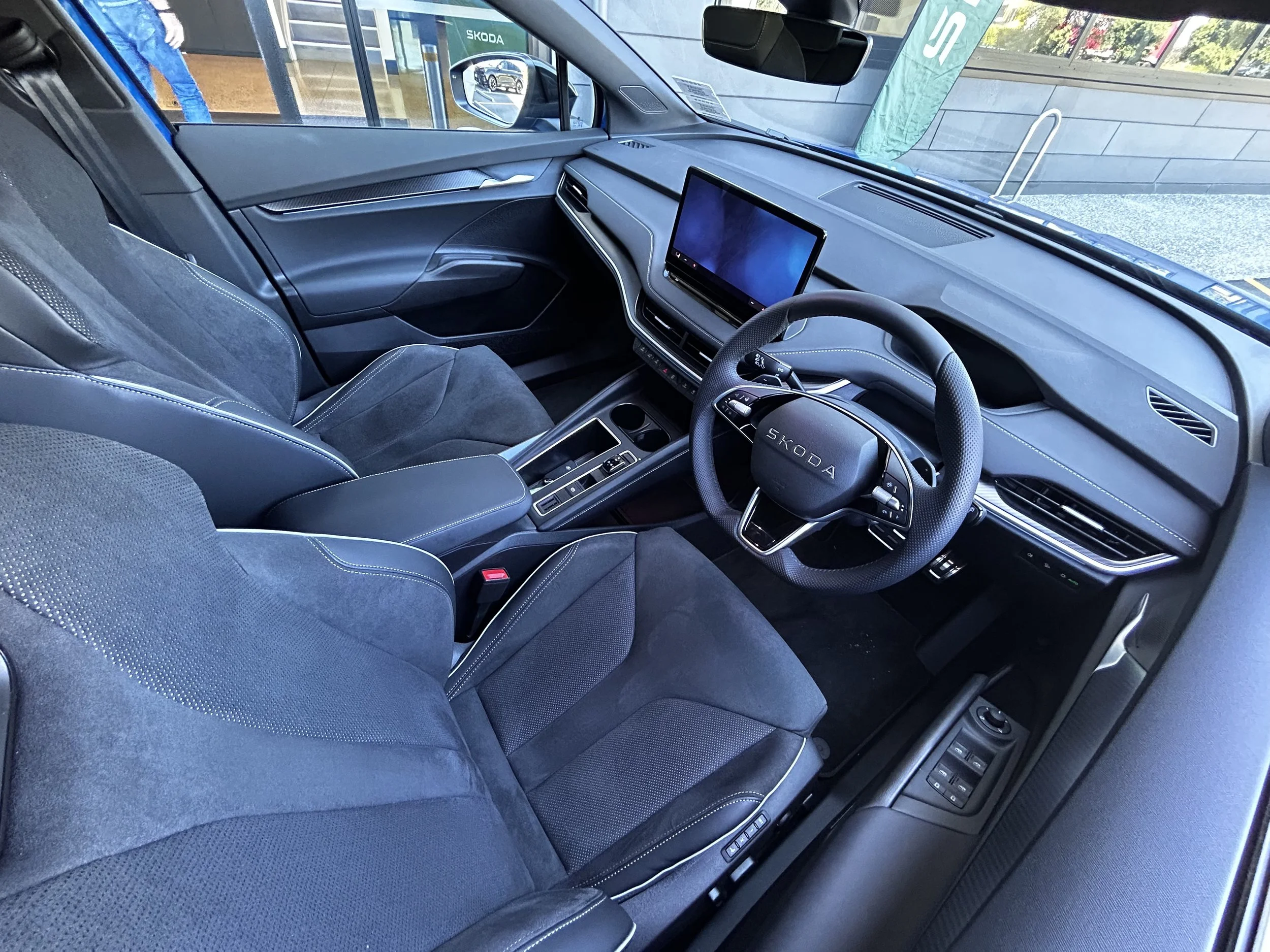 The cabin design also mirrors the Enyaq, featuring a perforated leather steering wheel ahead of a 5.0-inch digital cluster and a 13.0-inch central touchscreen, but feels a touch cosier front and rear.