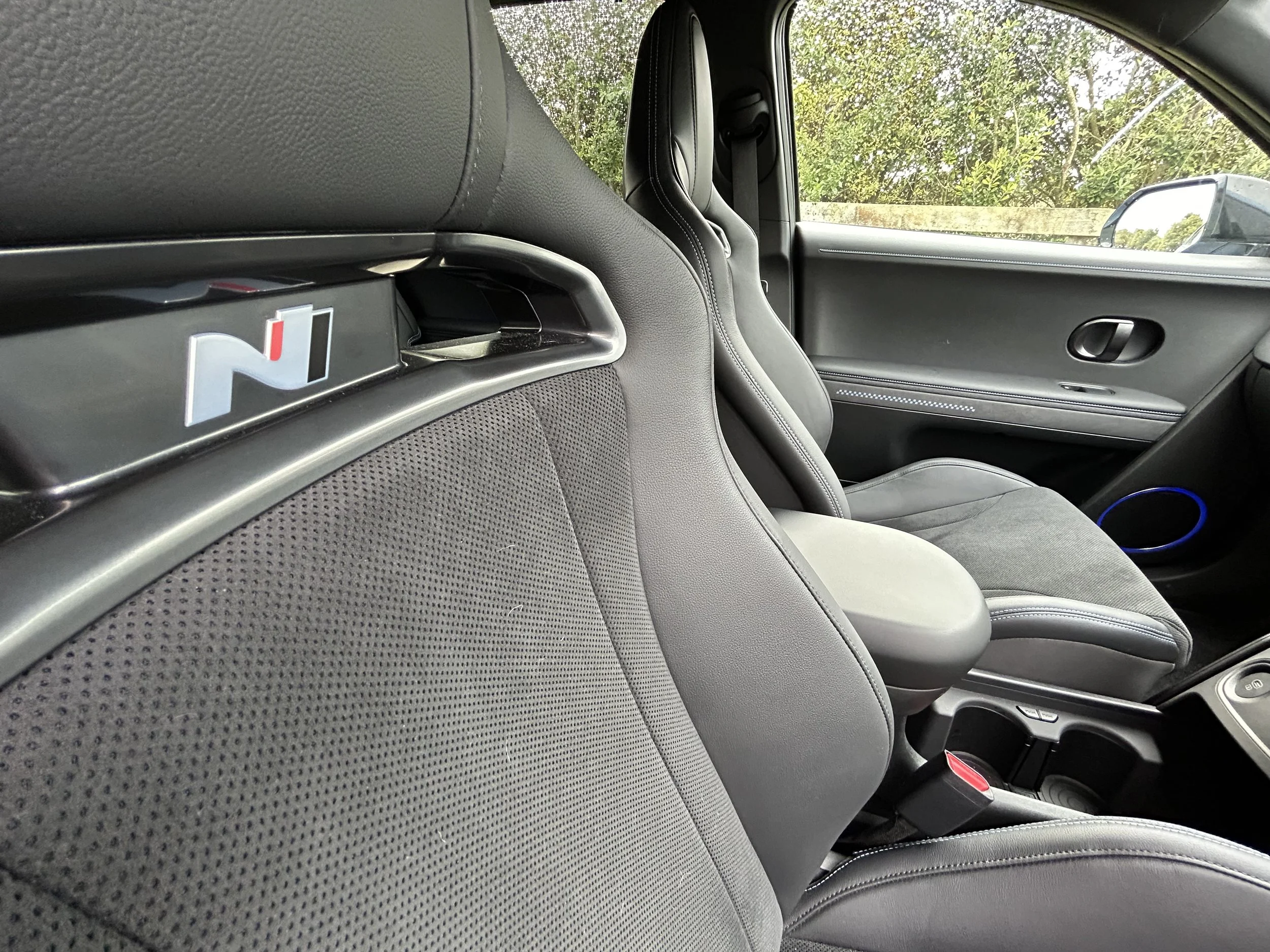 That motif can be found in the door sills as well on entry to a heavily N-branded interior that's darker in theme than the standard Ioniq 5's. It keeps a five-seat layout, but the front chairs are new low-slung bucket seats with tactile upholstery and illumination of the N logo.