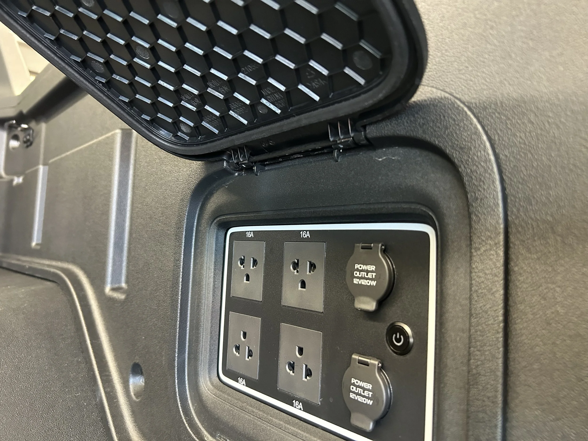 The RD6 has four tie down points and the tray has a rubberised protection. It also features six power sockets - four for three-point plugs (their design will be altered to suit NZ types) and two for round types - and a fold out step coming off the tailgate, designed to take up to 150kg.