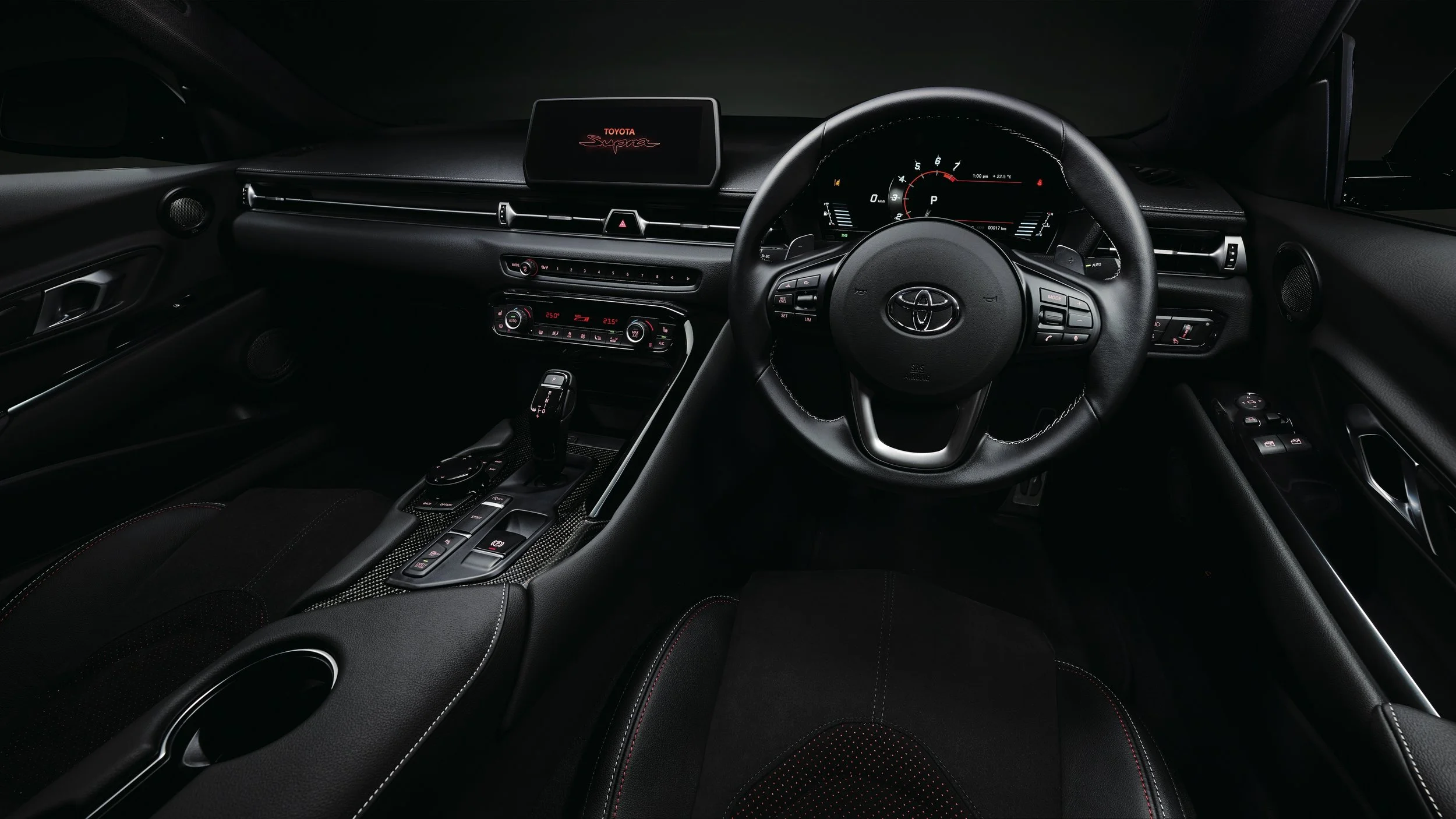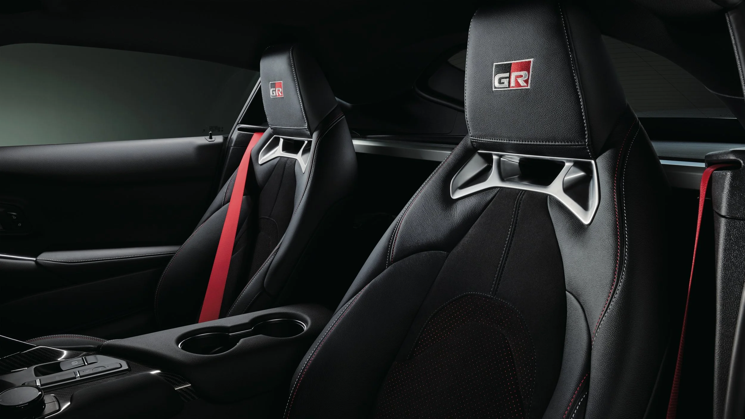 The front brakes are upgraded and enlarged to 374mm discs while there are 19-inch matte-black alloy wheels, red seat belts, and a red ring around the shift knob for the manual model. Black Alcantara upholstery with embroidered GR headrest logos is standard.