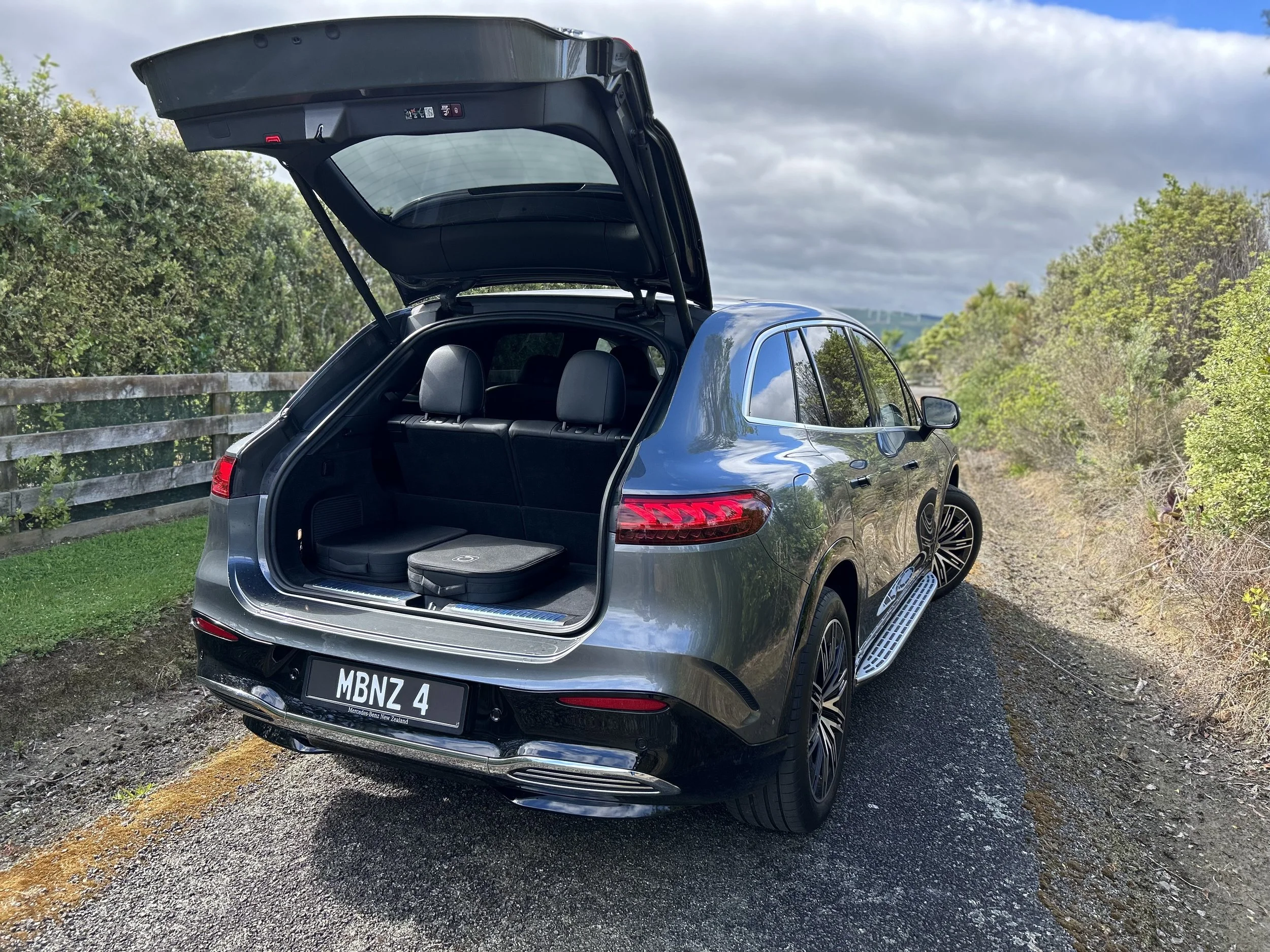 Access to the rearmost row is via the middle row, which all adjusts electrically. Entry and egress is fair. While legroom back there is tight for the tall, it offers good headroom and also, as SUVs go, the EQS is reasonably low-set. To point, actually, where the cost-plus running boards seem an unnecessary addition; if anything, they just raise the chance of leaving a mark on your clothing as you step out.