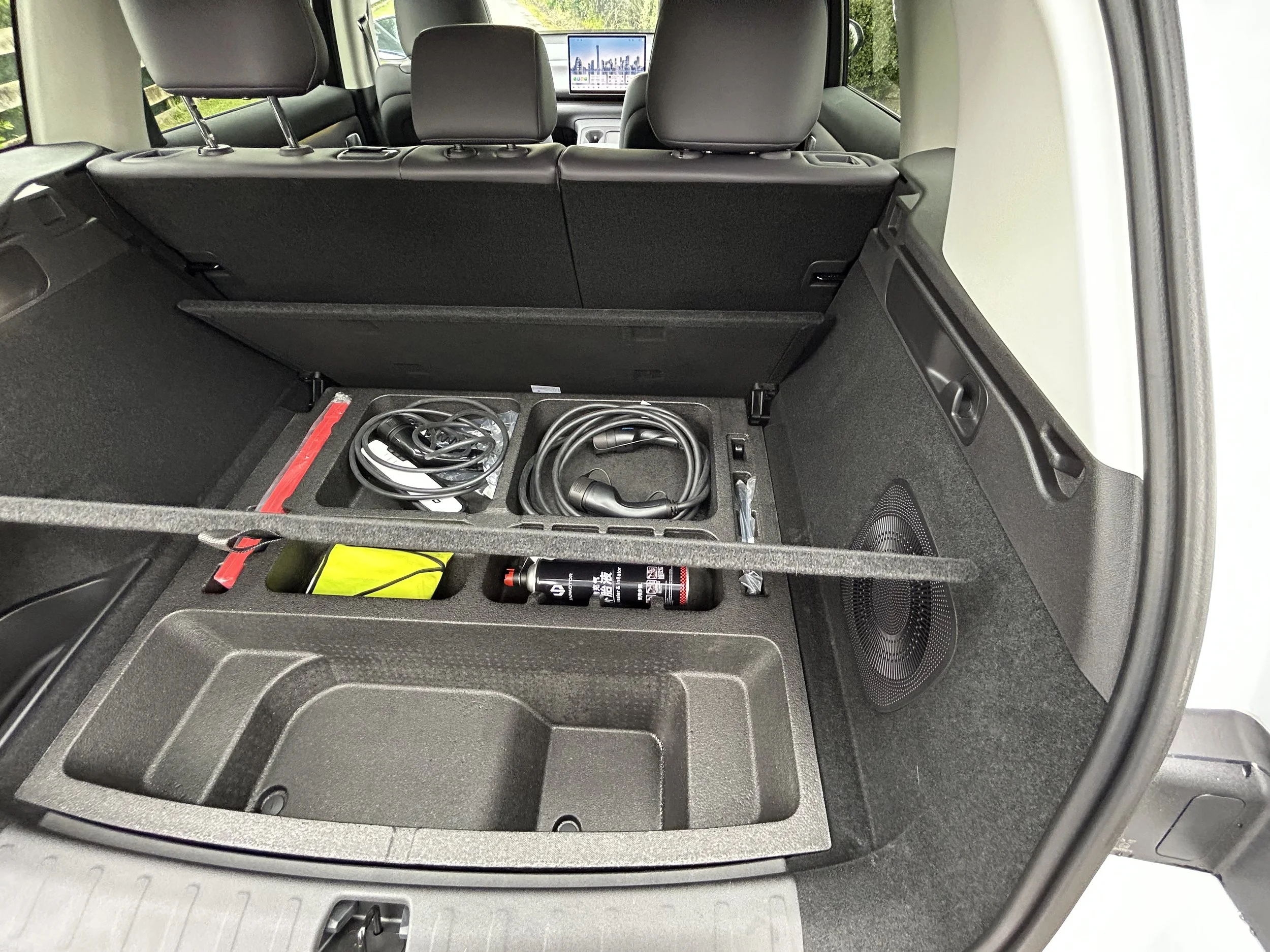 The area underneath the boot floor has two storage bays, one filled with two charging cables, one for home the other for on the run attached to a type 2 input, and an inflator kit (as there’s no spare). the other is there for your odds and ends. There’s no frunk up front, even though there appears to be enough room, as drivetrain elements are set very low.