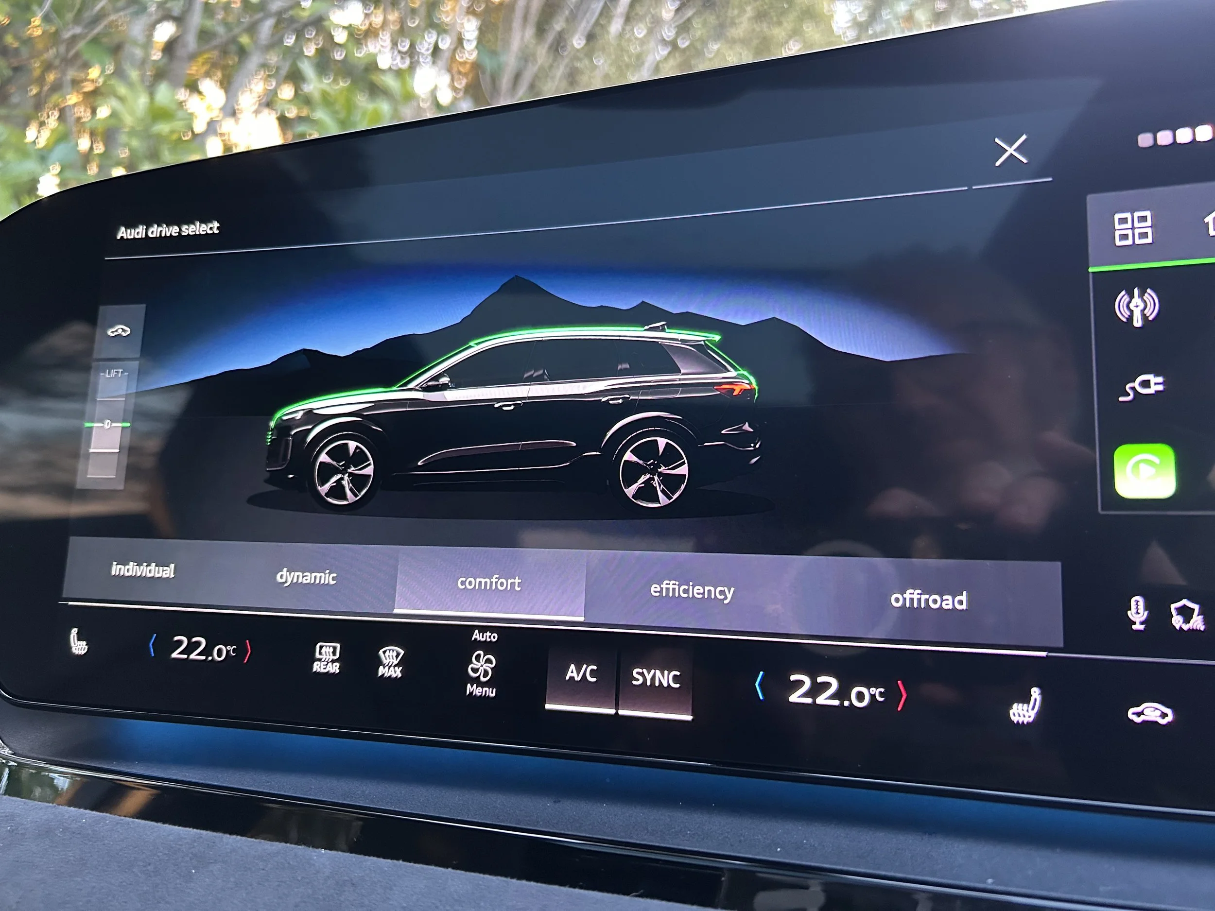 Most of the time when you lift off the accelerator pedal, the car will slow down and put energy back into the battery. This can be driver-adjusted by cycling through the menu controlled via a paddle on the back of the steering wheel. In the strongest setting, a one-pedal driving feel - a 101 for most EVS, but a first Audi’s. It’s nicely tailored; not too little, not too much. You can use it to retard on descents, but it isn’t so brutal as to tip it onto its nose.