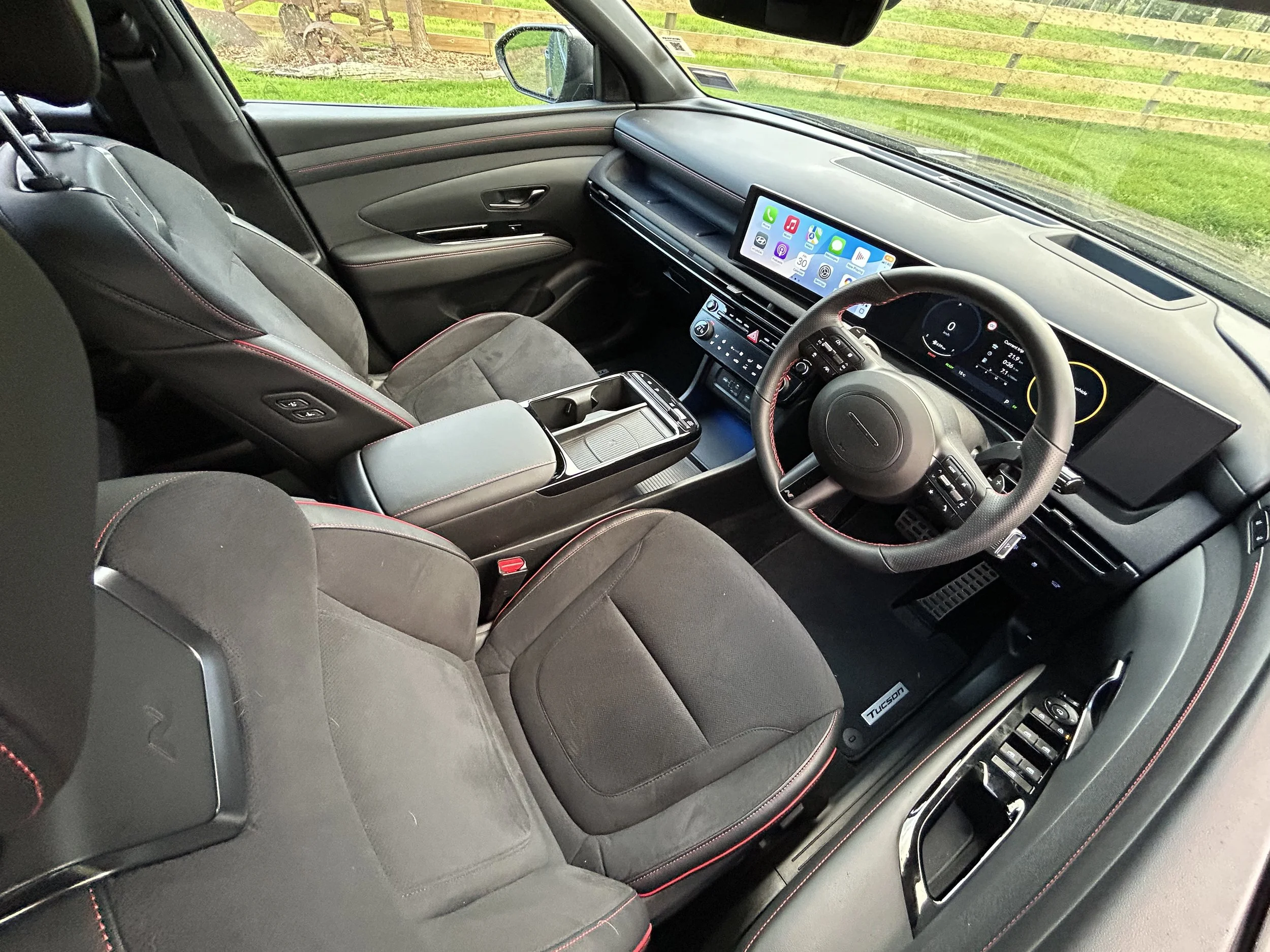 As much as Tucson in any format is a striking car, it’s all the better with N-Line, which adds 19-inch wheels in place of the otherwise standard 18s, a sports body kit, adaptive LED headlights (rather than reflector-beam LEDs), 12.3-inch digital instrument cluster and some interior detailing, primarily leather and suede upholstery with red highlights.