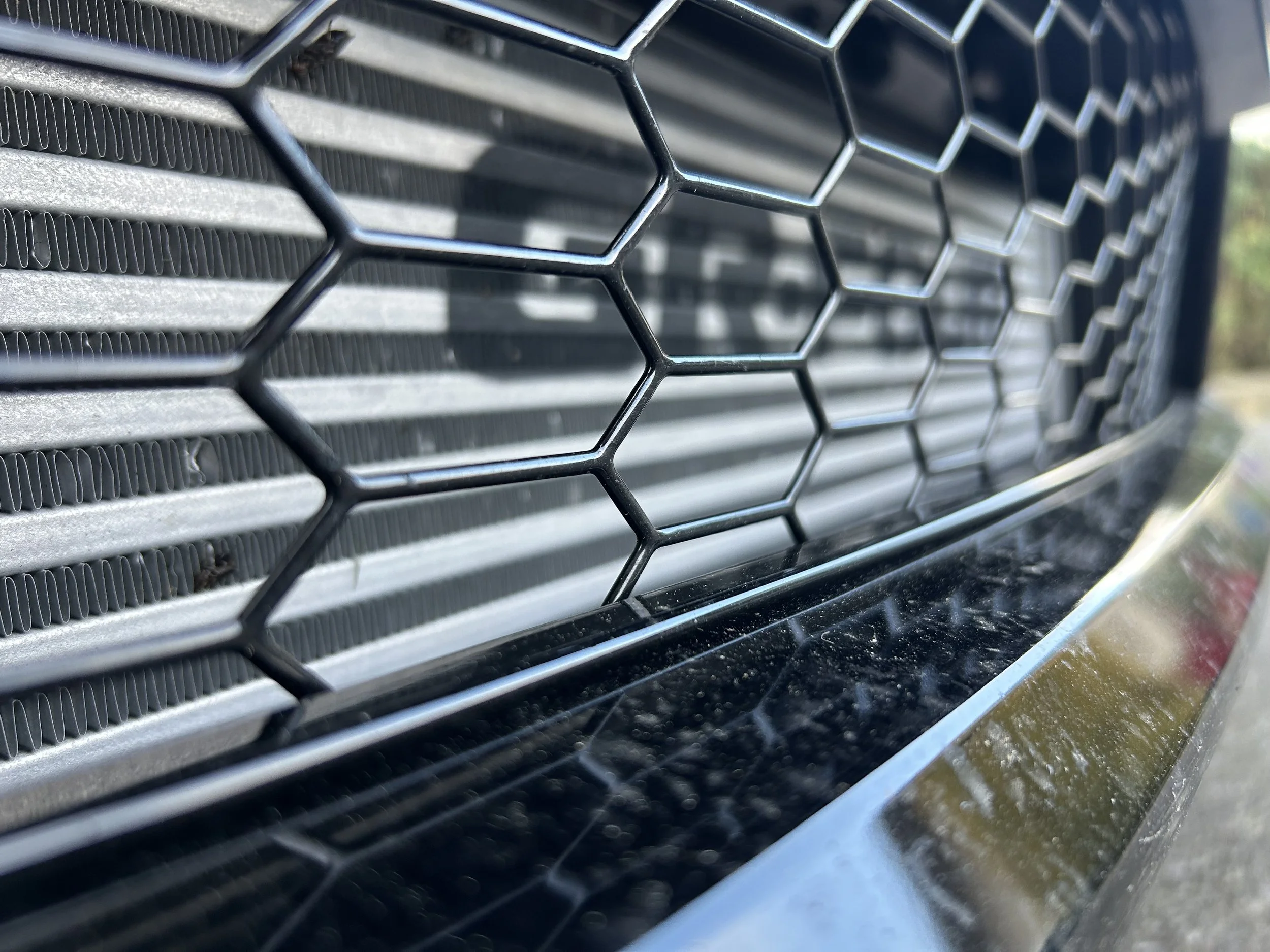 The centre section includes a larger cooling aperture, necessary for engine durability, and the grille is now made of metal, rather than plastic, so that debris doesn’t burst through it.
